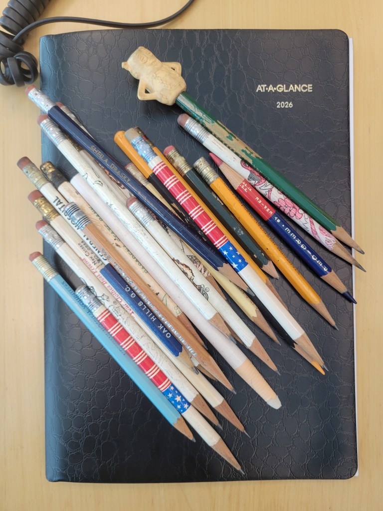 I can’t remember exactly when I did this, end of 2023, maybe March 2024 – we were cleaning out my parents house, my childhood home. A part of the journey of life. Anyways, the exact time isn’t important, the task apparently was. There were a million other things to do, I know. I stopped at the pencil cup, or cups. I think one was a blue ceramic golf bag. I picked through all the pencils. I probably spent a half hour doing this. Pause. Refer back to the ‘there were a million other things to do” sentence, please. I, instead, did this. I sorted through old pencils and put them in my suitcase.