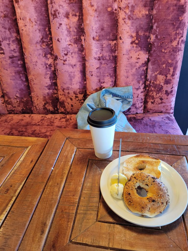 What would a wannabe writer be without a post from a café on a cold, after snowstorm, Connecticut Monday morning…so here you have it! My “chai latte & everything bagel with butter” post!